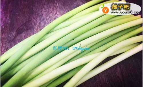 4准备少许蒜薹,将其头尾对齐,切成小段状。