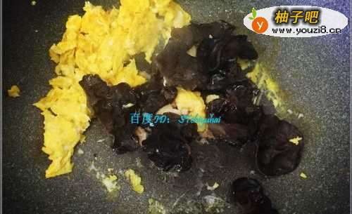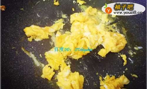 8将鸡蛋捣碎,然后拨至另一边,重新加入少许油,放入姜蒜爆香。