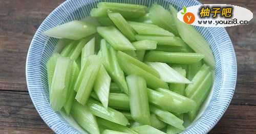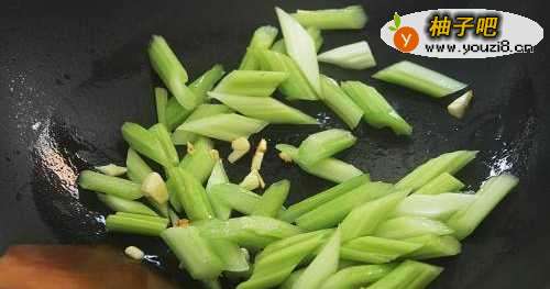 5锅里倒入适量油,放蒜末爆香后,加入西芹进行翻炒至翠绿色