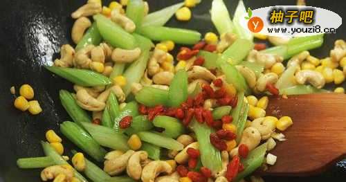 8最后倒入腰果和枸杞翻炒,放入鸡粉炒匀即可出锅
