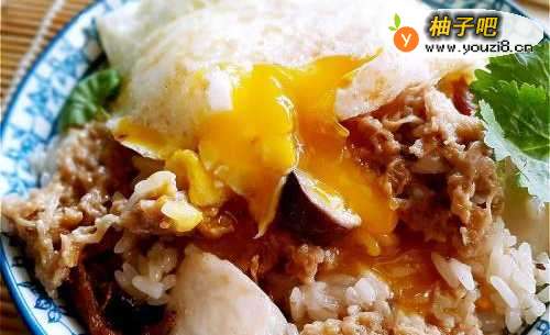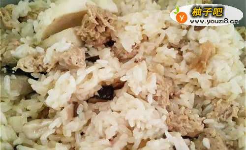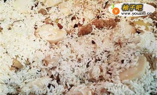 4将洗好的糯米饭倒入,一起翻炒至3分熟即可。