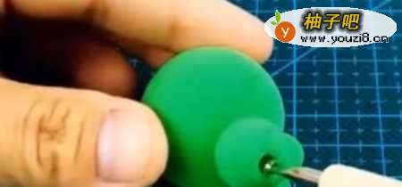 3再用铁棒在绿色大球上穿一个小洞,但不要穿过。