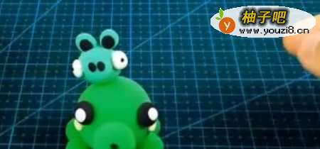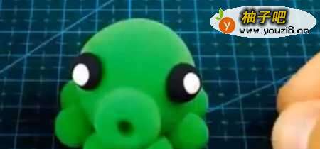 4再捏两个黑色的小球上面粘一个白色的小球,再把黑色小球黏在绿色大球的两边。