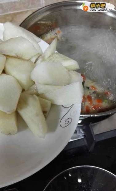 2山药削皮(注意削皮的时候,山药粘液可能会刺激皮肤,引起皮肤过敏),切段配用。