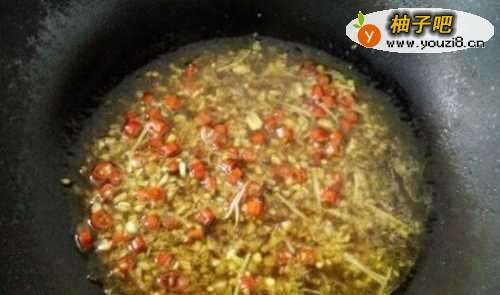 5锅中少许油烧热,加入小米辣、蒜末爆香,加入生抽、盐、糖、醋、金针菇汁煮开。