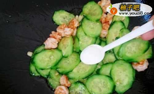 6:热锅倒油,煸香蒜末,放入黄瓜片翻炒至软后,倒入炒好的虾仁。