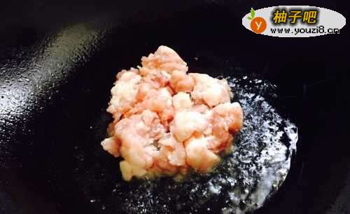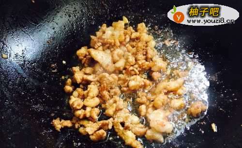 2接下来开火,锅烧热加入少许油,油热了后把肉沫倒进去翻炒,翻炒至肉沫发白后加入姜蒜末一起煸香。