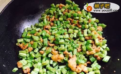 3肉沫炒了大概2分钟后加入1勺酱油继续翻炒一会,然后把切好的四季豆粒倒进去大火翻炒!