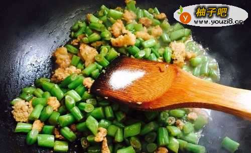 5四季豆水分差不多烧干之后加入少许盐进行调味即可熄火。
