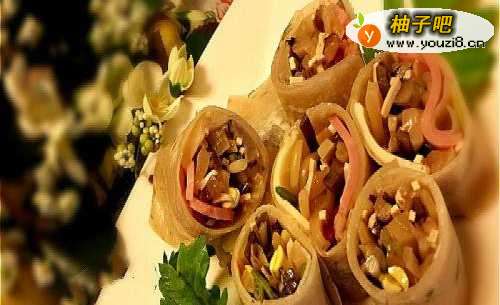 5将炒好杂蔬均匀铺上蛋舍捕饼皮,放上火腿片与起士片,卷起即可