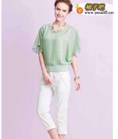 休闲宽松蝙蝠荷叶袖松紧收腰双层雪纺上衣,经典圆领设计,典雅大方,衬托脸型,凸显颈部柔美线条,荷叶边蝙蝠袖,弧形面料自然垂叠成美好的边沿,飘逸浪漫,下摆拼接腰育克收尾,收敛蝙蝠袖的散放线条,自然修身。