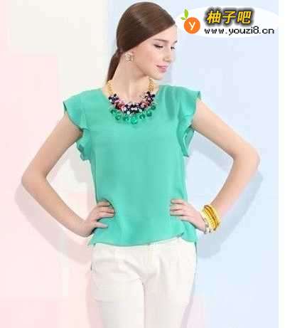 淑女雪纺上衣淑女荷叶边圆领短袖休闲雪纺上衣,简洁大气的圆领,贴合颈部线条,优雅甜美,浪漫荷叶边袖口设计,能遮住手臂小赘肉,漂亮的冰激凌色,随意的搭配白色裤子,清新抢眼十足。