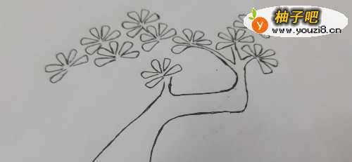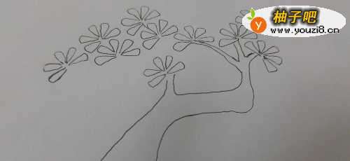 5然后在最左侧的枝丫部位,再多画几片的松树的叶子,使得叶子呈蓬松的状态。