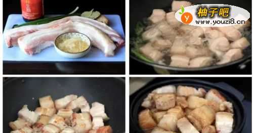 首先在锅中加入适量水,煮沸,添加切好的猪肉块,倒入适量的料酒、姜片和2棵葱。煮至4分钟后,捞出猪肉,用温水冲洗一下再沥干。然后将猪肉放置锅中,炒至两面微带焦黄,再转移到砂锅中。(注:砂锅要提前预热,要在底部刷上一层油,并加入适量葱和姜片)