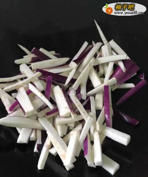 茄子去头,洗干净,切条,泡进水里。泡进水里,茄子才不会变黑。泡8分钟左右捞起来晾干水分。