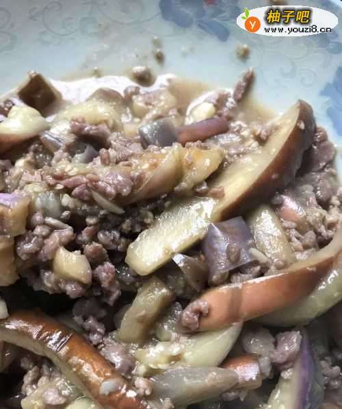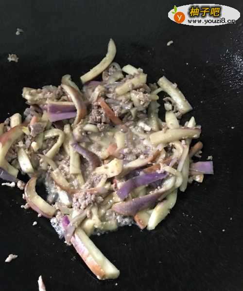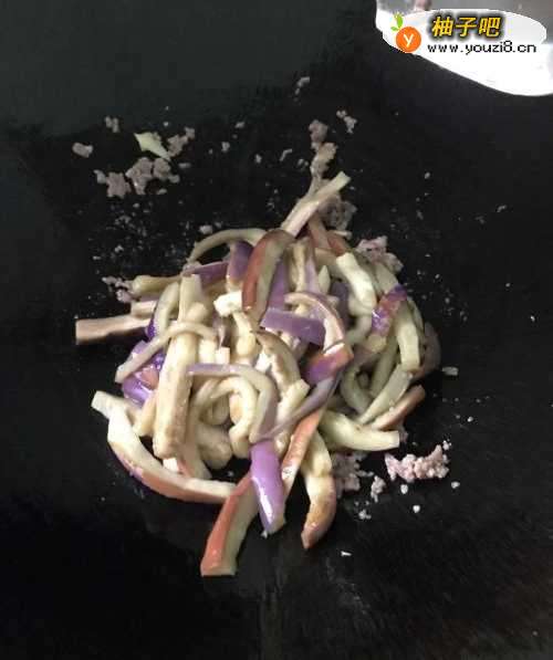 5翻炒到肉沫差不多熟,然后倒进茄子,继续翻炒,放适量的水焖煮一会。