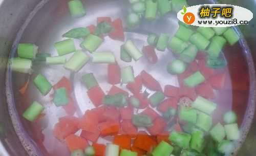 4:锅中注水烧沸,撒一勺盐,倒入胡萝卜和芦笋,焯至断生后捞出过凉水。