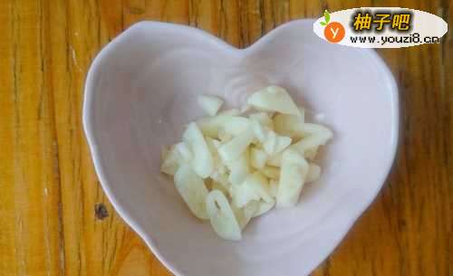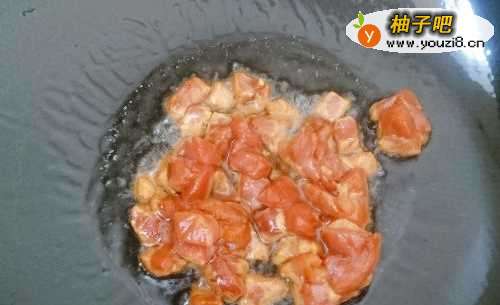 5热锅倒油,放入肉丁煸炒至变色后,倒入蒜末,炒出香味来。