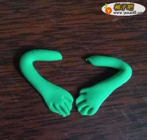 6接下来就是青蛙的前肢了,取两块绿色粘土捏成长长的一段扁扁的,再将扁扁的那端捏出青蛙的手掌。前肢稍弯曲立体即可。