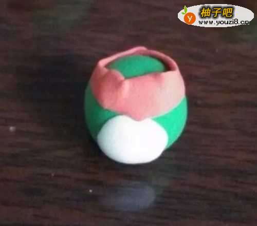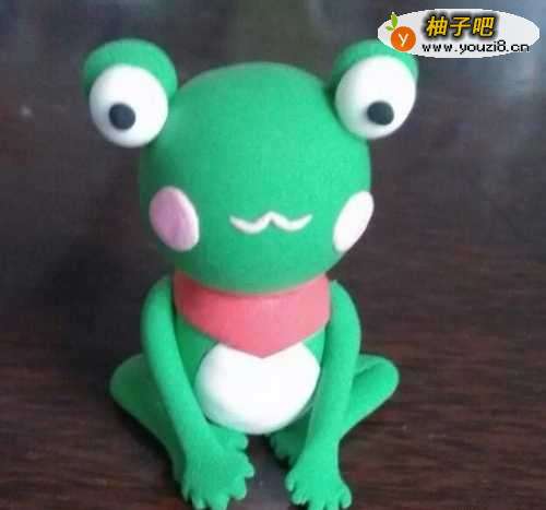 4取绿色的粘土按照步骤一将其揉搓成小圆球,也可以在步骤一的时候两个小球一起捏出来,再用一小块白色的粘土拍至扁扁的做为青蛙的白肚皮,最后用红色的粘土给青蛙的脖子上围一圈,这样就好了。