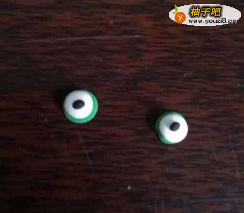 2取绿色粘土一小块揉搓成圆圆扁扁的,取白色粘土比绿色稍小一点点搓成圆圆扁扁的,取黑色粘土一点点即可,捏成细细的小球,如图即可。