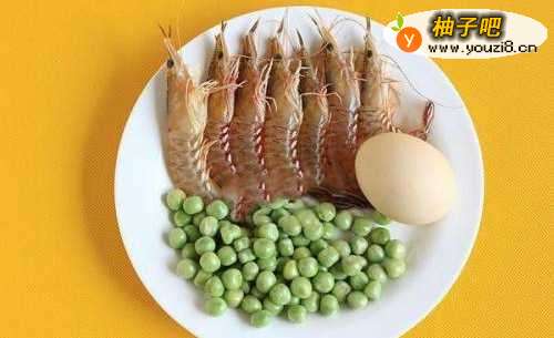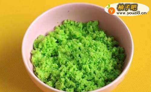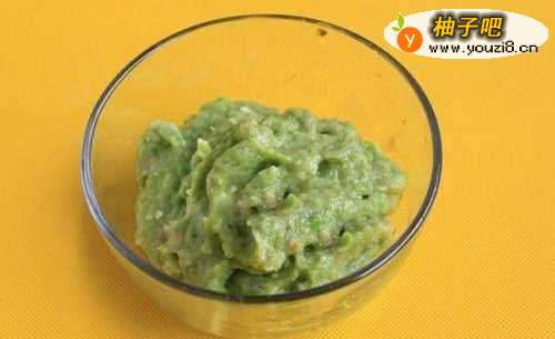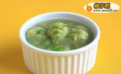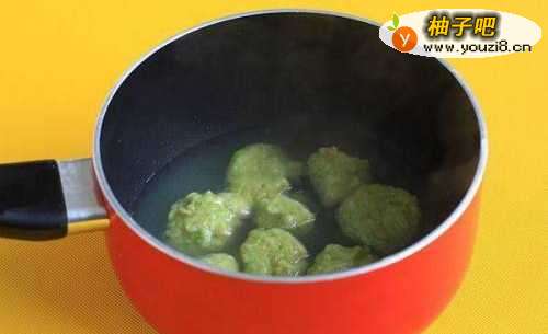 4将虾泥和豌豆泥混合,加蛋清、盐、胡椒粉、糖往同一方向搅拌上劲。用清水加姜片煮开,加少许色拉油转小火。