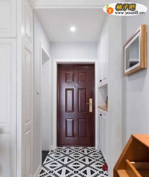 入户玄关地面铺贴黑与白小花砖,与客厅餐厅的木质地板做了材质区别。相比纯色地板砖,花砖的装饰设计感更强。