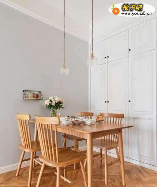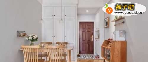3入户玄关进去便是餐厅,最打动人的便是占据一整块墙的白色收纳柜,到顶设计方案,与吊顶合为一体,装饰性与实用性兼具。