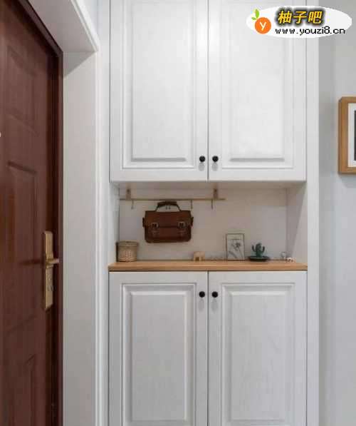 2玄关柜嵌入原墙面10cm,确保有充足的室内空间供人出入;柜子底端悬空,能够用于放屋主常穿的鞋子,如此一来就不需要经常开关柜门了。柜体中部部位也空出,便于收纳整理零散的小物件。