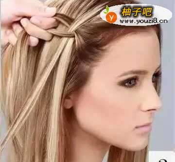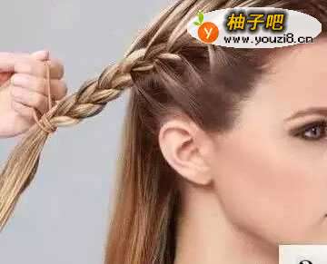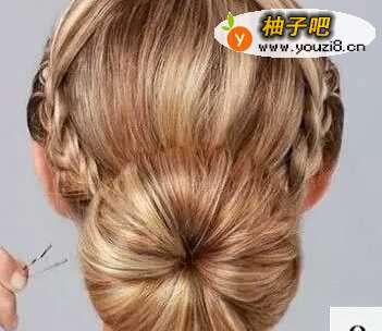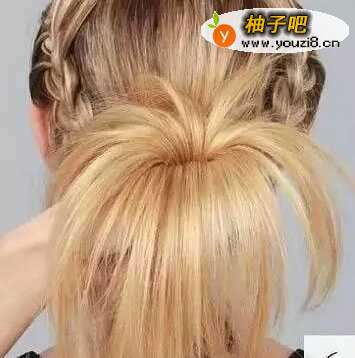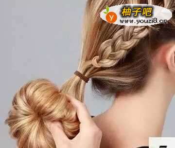 5两个辫子中间剩余头发与辫子一同扎成马尾,准备一个宽且柔软的大发圈