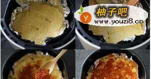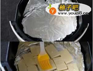 3空气炸锅放一层锡纸铺好,刷一层厚厚的底油,把包浆豆腐平铺在炸锅里,再用刷子把豆腐表面也刷上油,多刷几次,没刷完的油直接倒进锅里,200度烤8分钟
