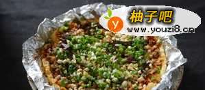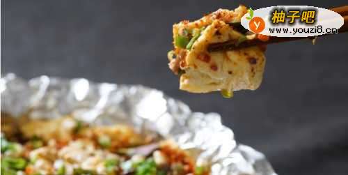 5烤好的包浆豆腐趁热依次撒入大头菜/榨菜、折耳根、花生碎、葱花,带锡纸取出放入盘中即可