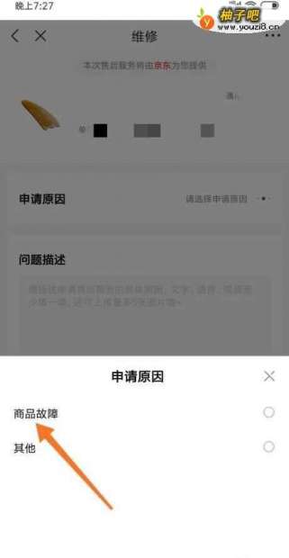6第六步,我们选择一个申请的原因,我们选择【商品故障】(根据自己需求操作),详细如下图