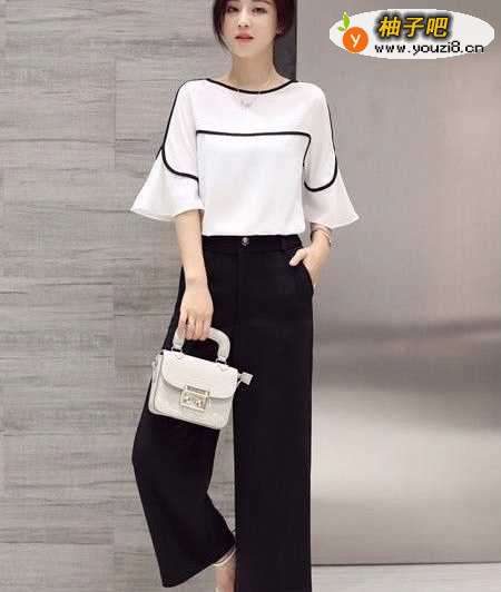 搭配二:黑色大脚裤+白色一字肩上衣这套搭配就属于潮流、性感的风格了,白色一字肩上衣简单、时髦,搭配一条同样非常时髦的黑色大脚裤,时尚感十足。