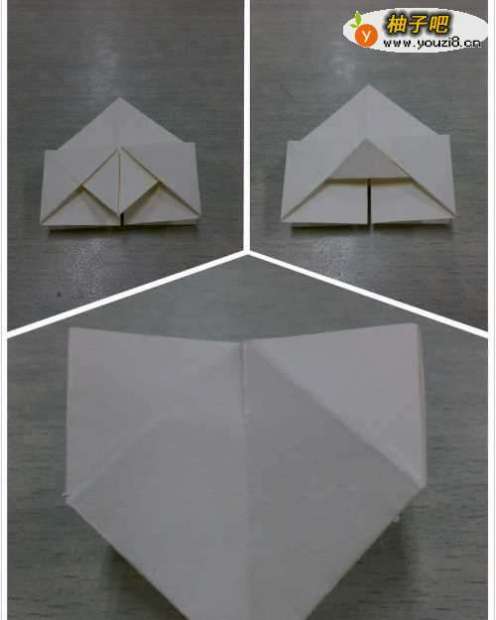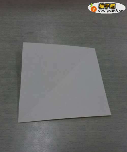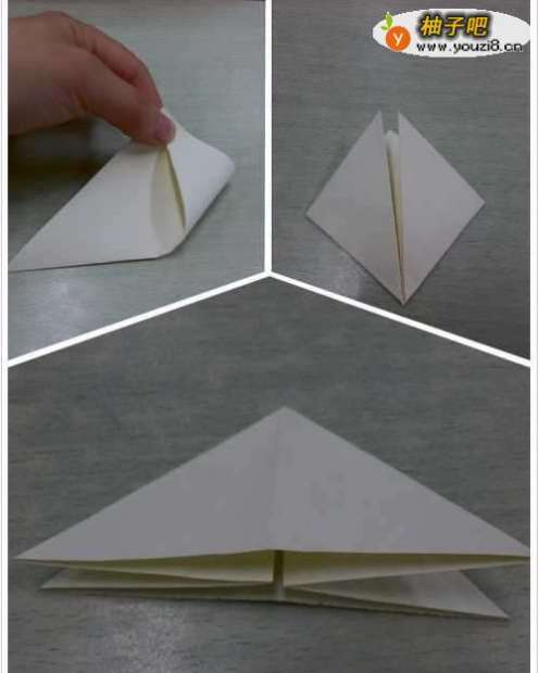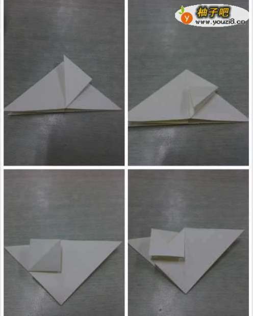 3上面的右边尖角沿中线向上折,再将折叠成的尖角向下对折。里面一层展开为正方形,再对折。另三个尖角进行同样操作。