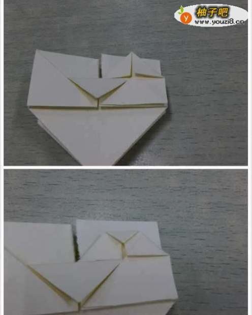 将折纸裁剪成正方形。两角对折成三角形。两边向上折。从后一层翻开成如图右边的尖角向上折。四个尖角一样。向下对折并展开。另三个翼进行同样操作。两边中间的三角形向下折。上部的纸撕开一点,撕到中间倒三角的边。将撕开的纸向内折成两个三角形将最上面的尖角向下折叠一点。其他三部分进行相同操作,翻过来就成了一个立体的爱心。
