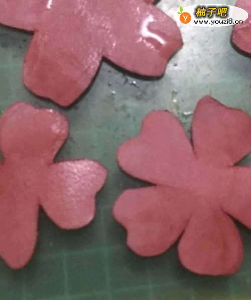 2剪下来以后,把大小不一的皮子花朵在清水里浸泡,植鞣皮浸泡一分钟就可以了,像平时的那种擦蜡皮的不太好吸水就多泡几分钟。