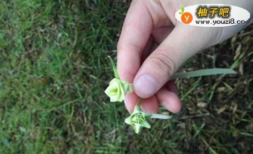 顺着小三角形的边把压在底下那半根棕榈叶折到上方,顺着边再把下面那半根棕榈叶也折到上方来,沿小三角形的边向上折起,就会出现一个角。一直重复上述步骤,一直到折出5个。