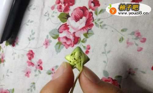 将取左右两端各一个三角并在一起。两根棕榈叶先后折向它们对着的那一面,注:在下方的那根棕榈叶要先折过去。顺着角折,慢慢就折好了。