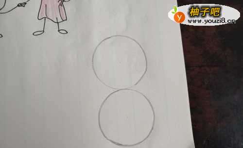 首先准备好绘画用的工具,纸,笔,圆规,彩铅。先在纸上用圆规画出两个圆。