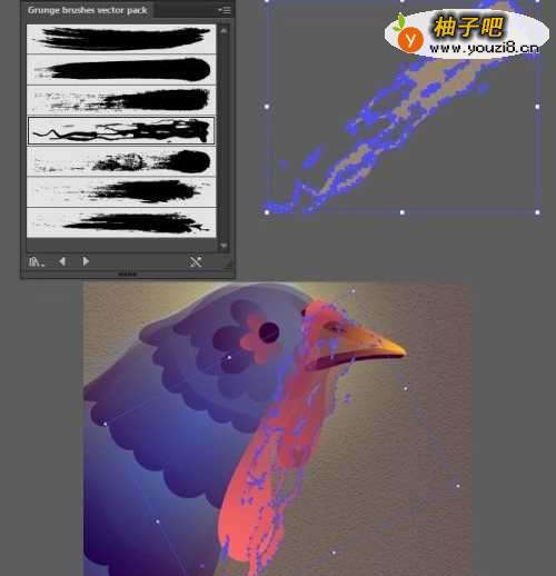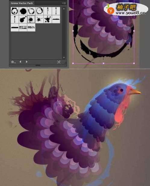 11接下来我们要对火鸡开始做一些“手脚”了。在画笔面板中,选择打开画笔库——矢量包——污渍笔刷。使用画笔工具,选择从上往下数第四个画笔,然后在火鸡的喙到肉垂部位画一道。使用变换工具改变笔划的大小,并将先前应用在肉垂部分的渐变效果应用到该笔划上。