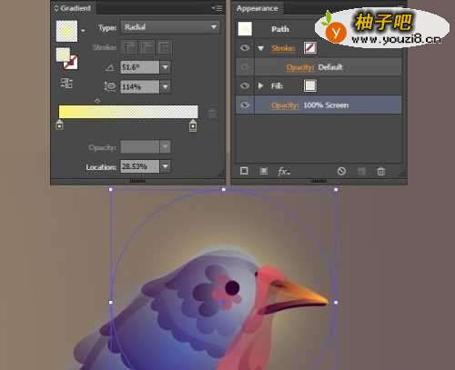 9使用椭圆工具在火鸡头部的后方绘制一个正圆形。使用渐变工具绘制渐变,颜色范围为100%不透明度的#fef35d到0%不透明度的相同颜色。在外观面板中将混合模式调整为筛选。