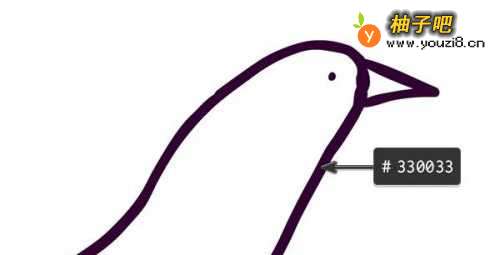 3我将轮廓线的颜色改为了深紫红色(颜色代码#330033),并且使用混合刷工具绘制了火鸡的喙,并点了一个小点儿来表示眼睛——我们的火鸡已经初具形状了。