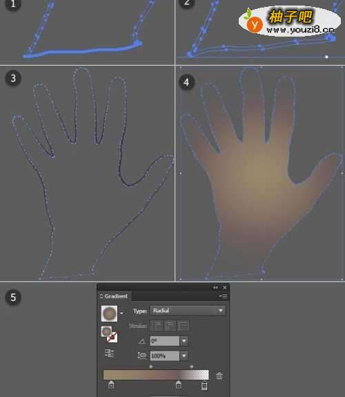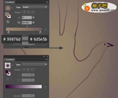 4使用矩形工具在你的绘画板上绘制一个大大的矩形,并在图层面板中将它放置在手型轮廓图层的下方。使用渐变面板,将矩形的渐变填充的颜色设置为:从#99876d到#6d5e5b,或者任何你喜欢的背景颜色。