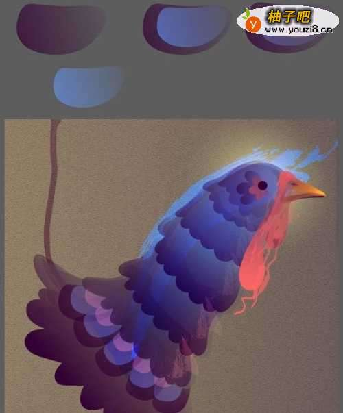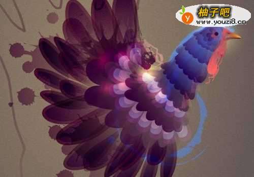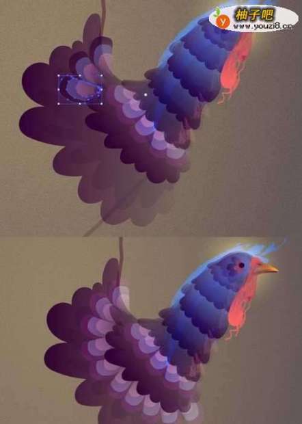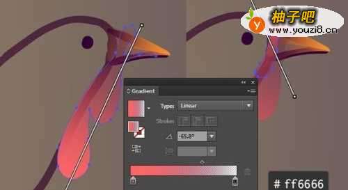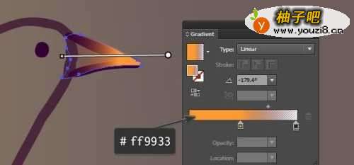 5在这篇教程中,我觉得使用铅笔工具来画会比较舒服。在喙的部位画出喙的形状并使用渐变工具填充渐变,颜色从是不透明度100%的#ff9933到不透明度0%的#330033。
