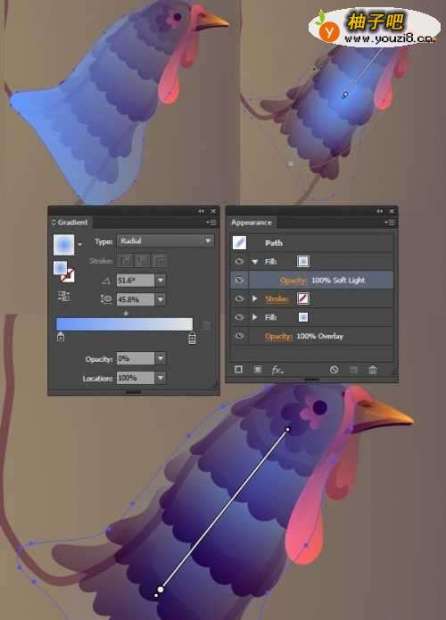 在外观选项中,将对象的混合模式调整为叠加,并将渐变的混合模式调整为柔光,这样火鸡的纹理就有着一缕柔和的蓝色了。