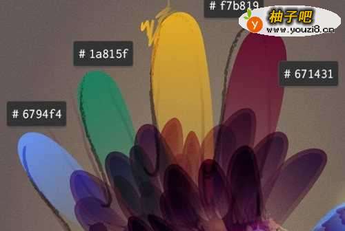 18使用渐变工具为每一个图形添加渐变,都是100%不透明度到0%不透明度的渐变。颜色,从左到右,分别为蓝色#6794f4,绿色1a815f,黄色#f7b819,以及红色#671431。使用斑点画笔工具来为这些形状添加与它们颜色相同的线条和墨迹。
