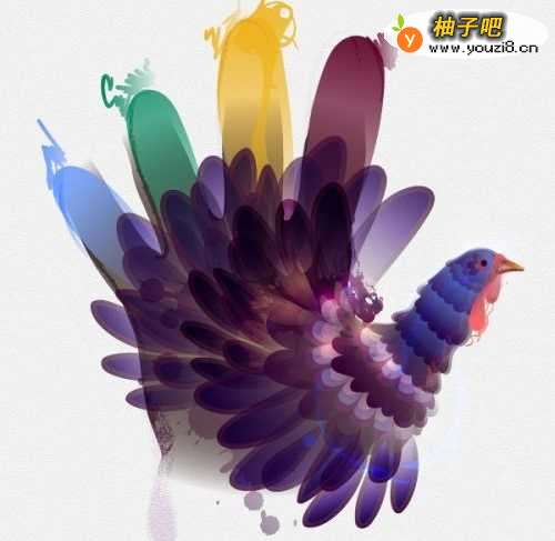 12换另一个污渍笔刷然后在火鸡的周围用蓝色,粉色和紫色涂抹,来创造更加真实的绘制效果。