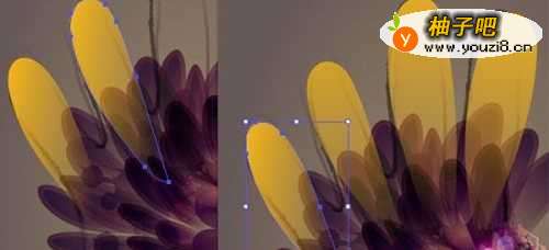 1,首先使用椭圆工具画出一个深紫色的小圆圈,当做眼睛。然后画出在眼睛后面的花瓣形状,使用粉色或者是紫色。