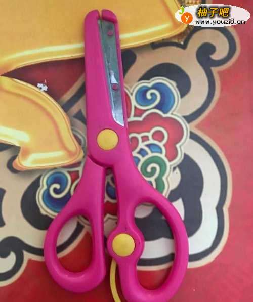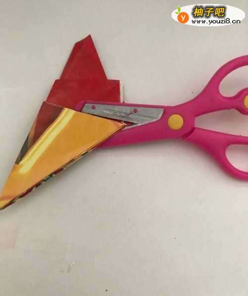 4第四步 两边都对齐折好之后 再把它拿起来 从背面再左右对折 然后拿起手工剪刀沿斜线剪去多余的部分